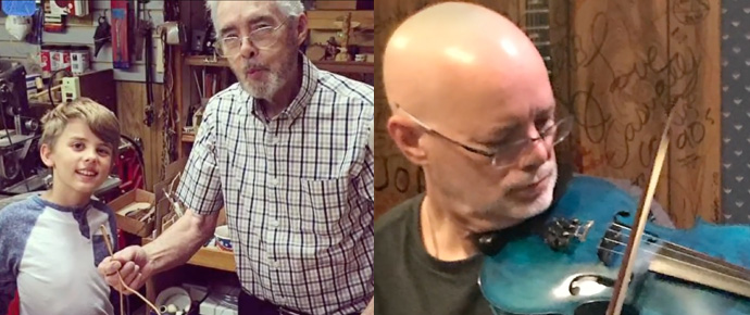 Don Hunt with one of his grandsons in the shop; Scott Hunt with his blue fiddle While perusing social media, I came across a tribute to a fiddle maker, Don Hunt. I was intrigued by the story of a luthier who
