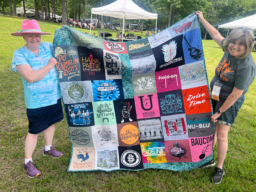 “For my husband’s quilt, I actually used a green grass fabric with a blue binding to signify the bluegrass. But in both quilts, it contains nothing but bluegrass-focused t-shirts [on the front].”