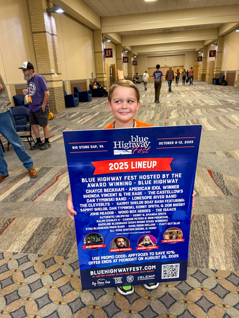The final reunion moment came when Paul and Kelsi Harrigill, late of Flatt Lonesome, showed up in the Exhibit Hall to play a radio show. The last time they were at IBMA, about six years ago, they carried their four-week-old baby Carter in a tiny basket. This time, Carter joined his parents for a song, then put on a little show of his own. First, he played an original song, then a cover, complete with a G-run. Then he took a deep bow and announced he would sign autographs.