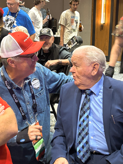 Next, I caught up with Paul Williams, a 90-year-old Hall of Famer, sitting with Jimmy Martin’s old Martin guitar outside the Exhibit Hall. But the trip was more than mere nostalgia. Williams still has the same golden voice he exhibited in Martin’s band. And he still has the desire to be part of the action. So there he was late in the week, appearing at a news conference announcing he signed a publishing deal to write for Tall Oaks Music.