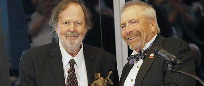Alan Munde accepts induction into the American Banjo Museum from Doug Parsons - photo © Pamm Tucker Over the weekend of September 23-24, the Bricktown region of downtown Oklahoma City was in the spotlight for banjo pickers and banjo lovers worldwide.